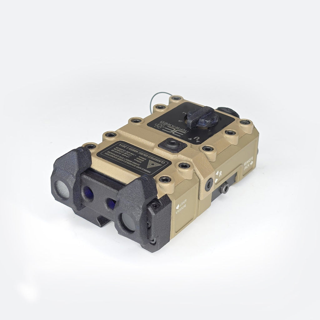 The most POWERFUL Civilian-Legal IR aiming device on the market! Tri-Witnessed – Visible Green laser, Infrared laser, VCSEL Illuminator, DMLS Aluminum & Ballistic Nylon Housing, MODE switch w/ parallel CRANE remote jack. Available in BLACK or FDE